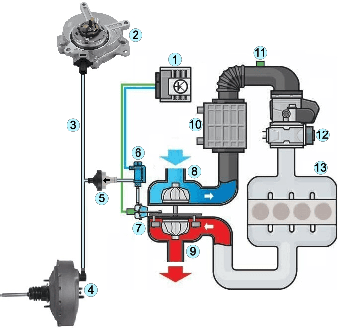 In de onderstaande afbeelding is de turbodrukregeling met de wastegateverstelling te zien. De vacuümpomp (2) voorziet zowel de rembekrachtiger (4) als de wastegate-verstelling op de turbo (7) van vacuüm. De éénrichtingsklep (5) zorgt dat de luchtstroom slechts één kant op kan: er kan vacuüm vanuit de wastegate worden getrokken, maar zodra het vacuüm aan de rembekrachtigerzijde deels wegvalt, bijvoorbeeld na herhaaldelijk (pompend) remmen en de vacuümpomp nog onvoldoende vacuüm heeft opgewekt, geen inloed hebben op de turbodrukregeling. De uitleg over de turbodrukregeling gaat verder onder de afbeelding.